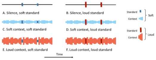 Figure 2 : Représentation schématique d’une expérience de discrimination d’intensité destinée à mettre en évidence l’adaptation de dynamique chez des participants normo-entendants. La plus petite différence d’intensité perceptible est mesurée à deux niveaux sonores : un niveau relativement faible (standard en bleu, gauche de la figure) et un niveau relativement élevé (standard en rouge, à droite). Ces seuils de discrimination sont déterminés dans le silence (A et B) pour référence mais également dans un contexte sonore de niveau faible (C, D) et fort (E et F). Une adaptation de la dynamique devrait se manifester par des performances en discrimination d’intensité meilleures lorsque les niveaux du standard et du contexte sont identiques (C et F) que lorsqu’ils sont différents (D et E). |