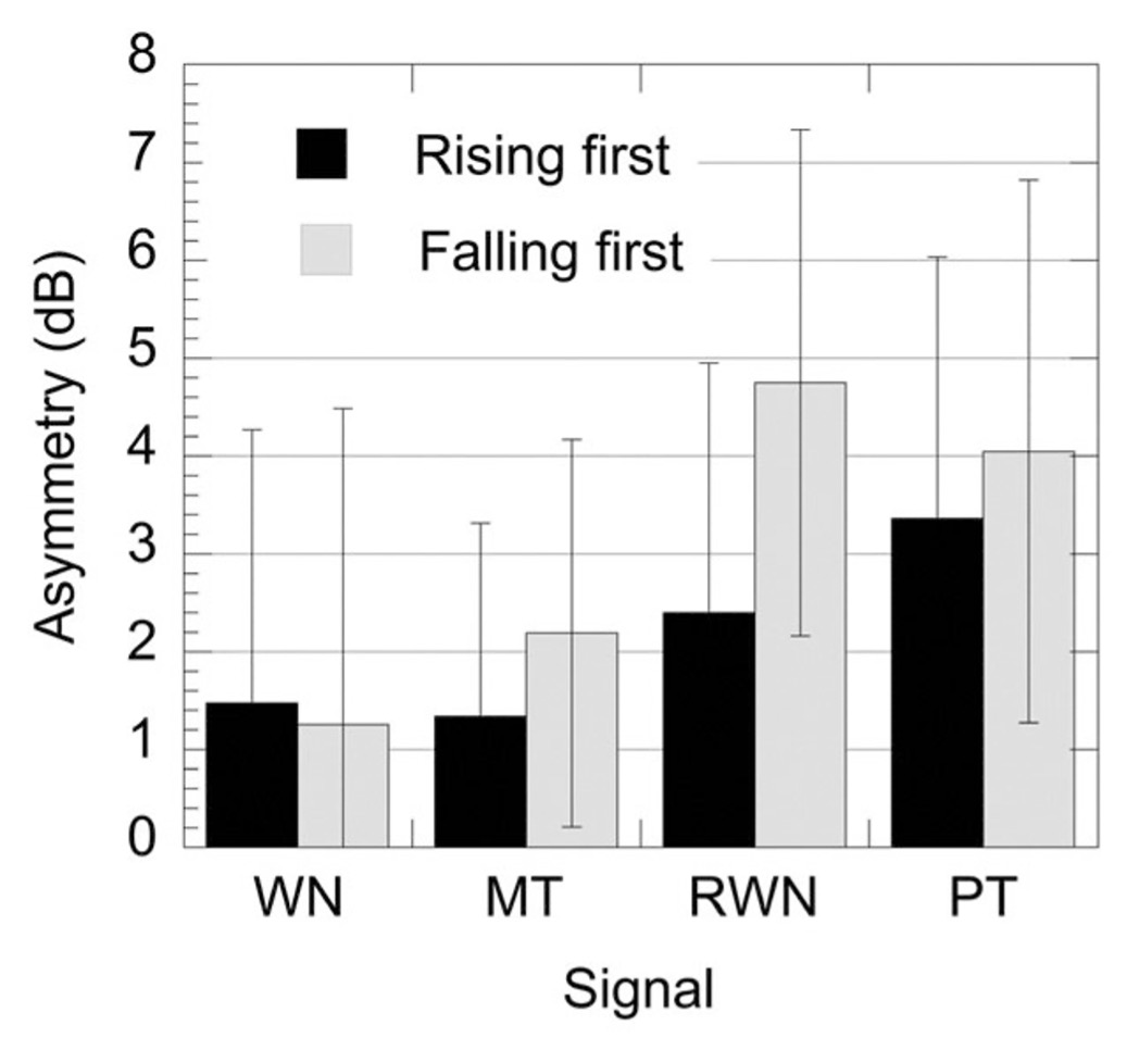 Figure 3 : Asymétries de sonie entre sons croissants et décroissants et effet de la saillance de hauteur tonale. Une asymétrie positive indique que le niveau du son décroissant doit être plus fort que celui du son croissant pour que les deux soient perçus comme ayant la même sonie, ce qui signifie que le son décroissant serait perçu comme mois fort que le son croissant de même niveau. Les barres d'erreur correspondent à l'écart-type. |