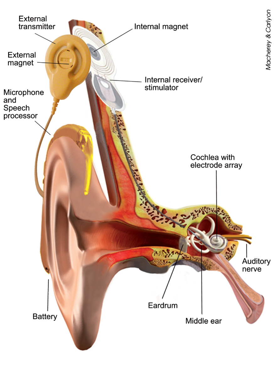 Figure 4 : Schéma d’un implant cochléaire montrant la partie externe comprenant le contour d’oreille (microphone et processeur vocal) et l’antenne émettrice et la partie interne montrant le récepteur/stimulateur et le faisceau d’électrodes implantées dans la cochlée stimulant électriquement les neurones du ganglion spiral |